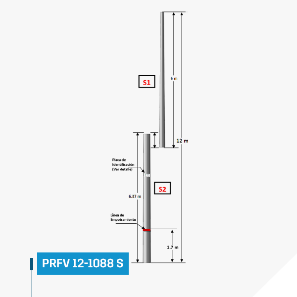 FRP Pole 12 m 1088 kgf sectioned or better called FRP‑12‑1088 S‑CTC of polyester reinforced with fiberglass.