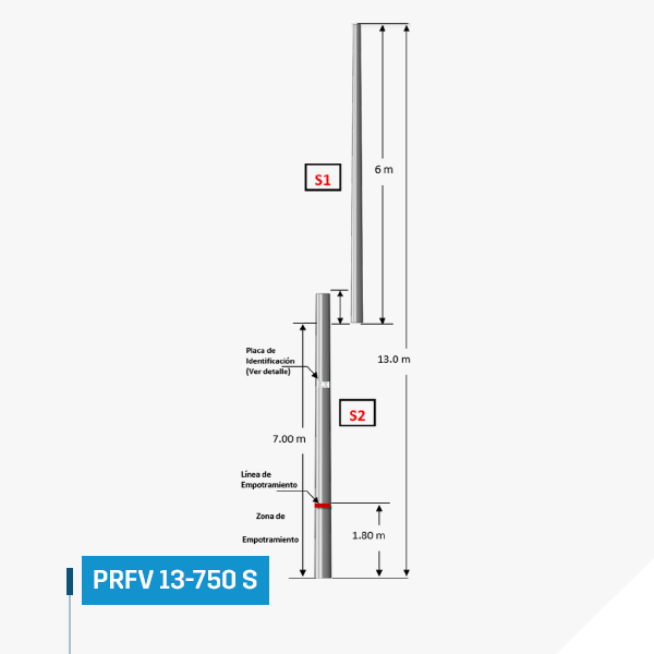 FRP Pole 13 m 750 kgf sectioned or better called FRP‑13‑750 S‑CTC of polyester reinforced with fiberglass.