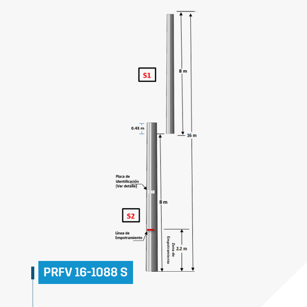 FRP Pole 16 m 1088 kgf sectioned or better called FRP‑16‑1088 S‑CTC of polyester reinforced with fiberglass.