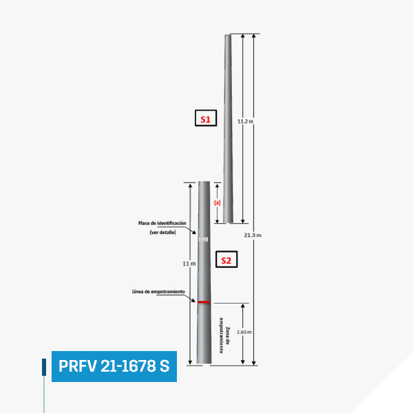 FRP Pole 21.3 m 1678 kgf sectioned or better called FRP‑21‑1678 S‑CTC of polyester reinforced with fiberglass.