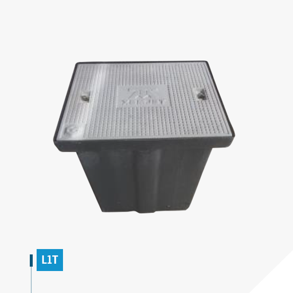 L1T fiberglass access vault with a reinforced fiberglass frame and a polymer concrete cover equipped with a stainless steel bolt for secure handling. Rated for 9.5 ton load capacity, and engineered to withstand extreme temperatures, provide flame retardance, and resist chemical agents.