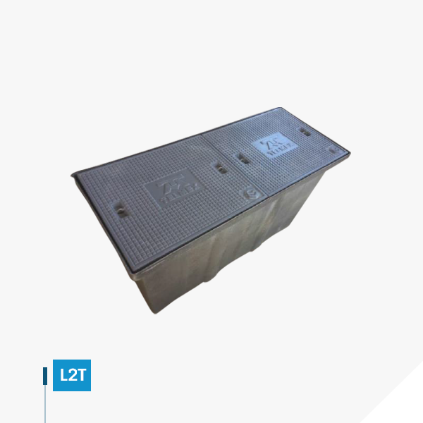 L2T fiberglass access vault with a reinforced fiberglass frame and a polymer concrete cover equipped with a stainless steel bolt for secure handling.